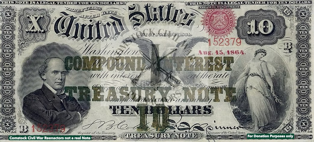 Comstock Civil War Re-Enactors have their own (mostly) historically accurate War Bonds. We will print your copy and send it to you in the mail. Your donation includes shipping. These bonds have no cash value, however the do help our group educate today’s youth about what happened, on both sides, of the Civil War.